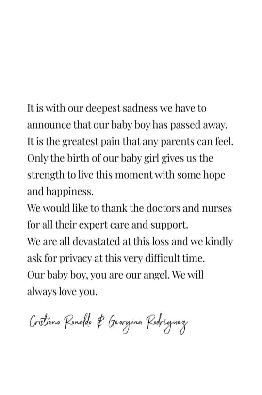 “Con nuestra más profunda tristeza tenemos que anunciar el fallecimiento de nuestro hijo. Es el dolor más grande que unos padres pueden sentir. Solo el nacimiento de nuestra hija nos da la fuerza para vivir este momento con algo de esperanza y felicidad. Queremos agradecer a los doctores y enfermeras por su cuidado y apoyo. Estamos devastados por esta pérdida y rogamos privacidad en este duro momento. Bebé, eres nuestro ángel. Siempre te amaremos”, informaron Cristiano Ronaldo y Georgina Rodríguez, a través de un comunicado.