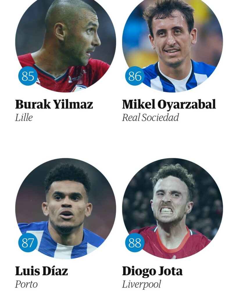 Duván Zapata , delantero del Atalanta, se encuentra en la posición número 83 y Luis Díaz, del Porto, se ubicó en la casilla 87.
