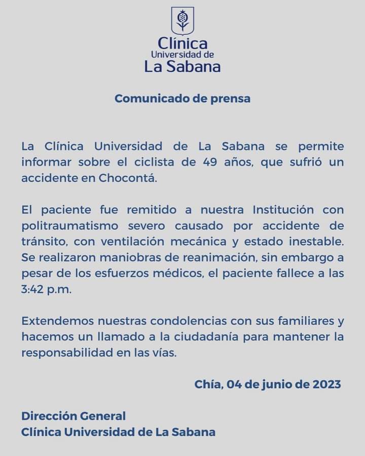 Según confirmó el Team Sistecrédito, “lastimosamente, el último reporte de la Clínica de la Sabana en Chía informa el fallecimiento de don Germán, padre, debido a la gravedad de sus heridas. Q.E.P.D”.