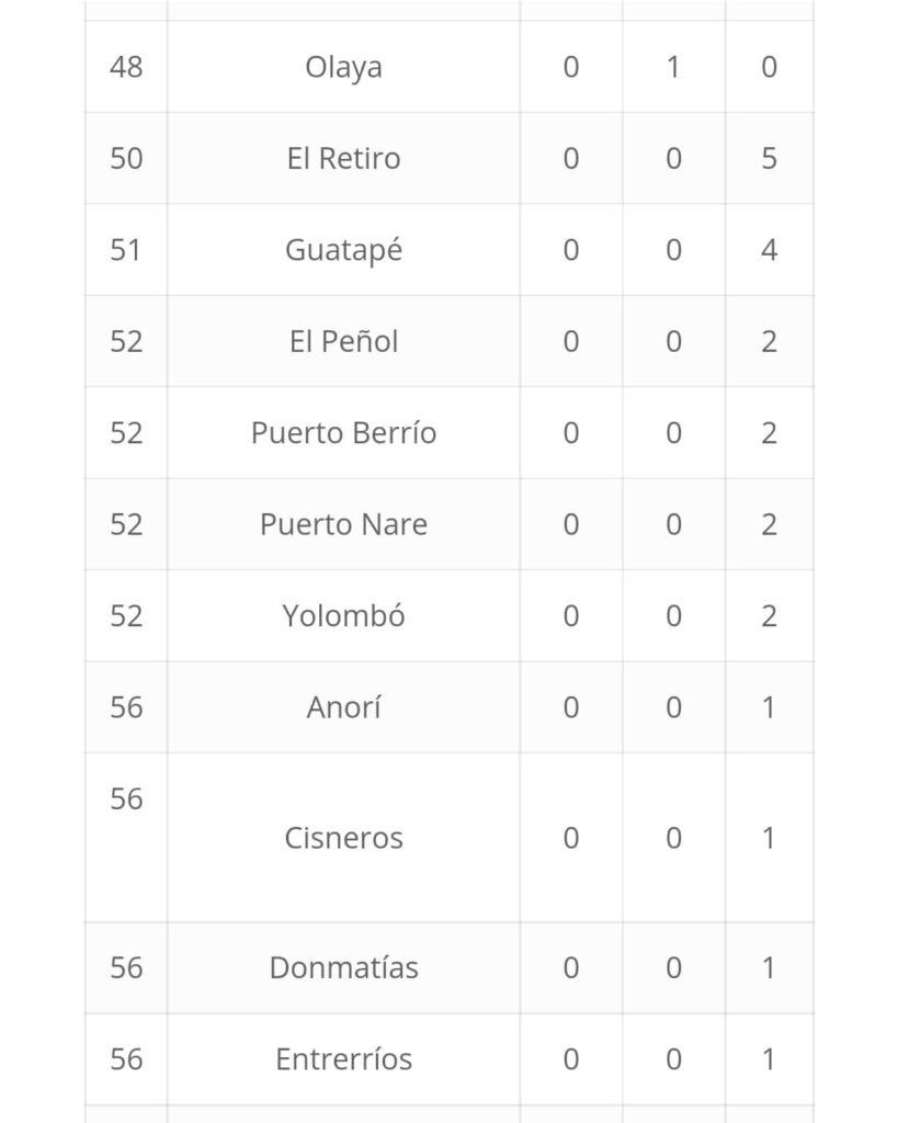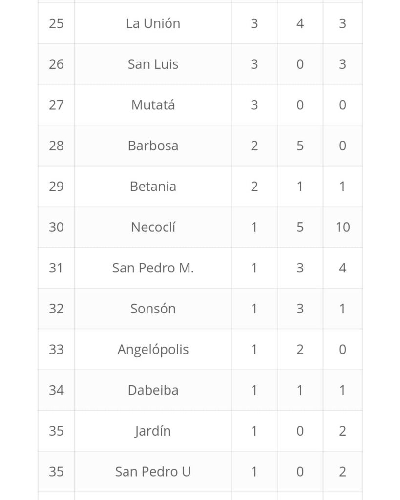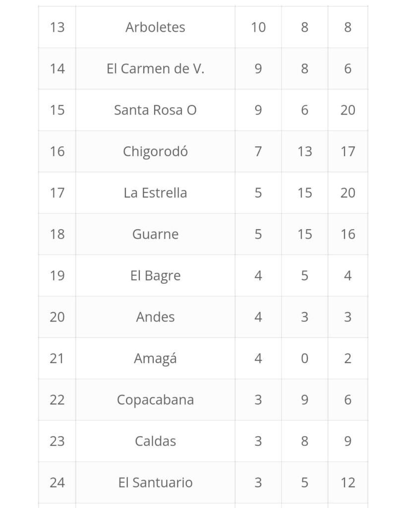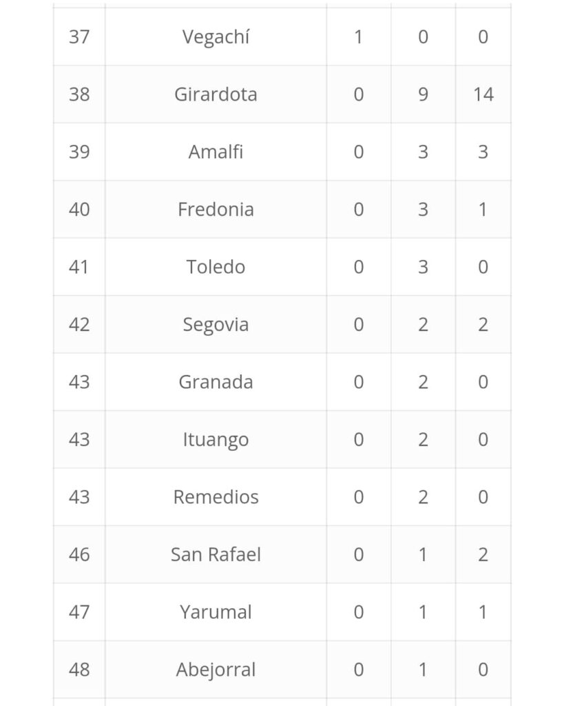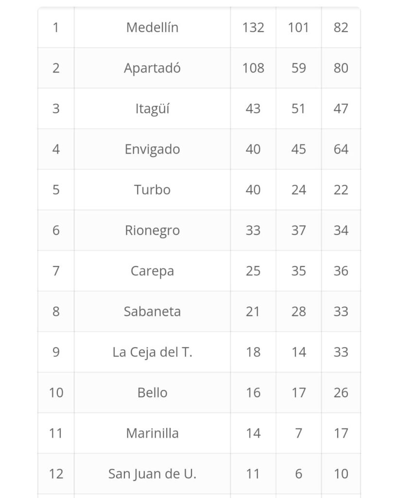 En cuanto a los municipios del Oriente, Rionegro tuvo una destacada actuación y fue sexto. La Ceja, que en las primeras jornadas estaba en el puesto 38, logró terminar noveno y Marinilla concluyó en la casilla 11.