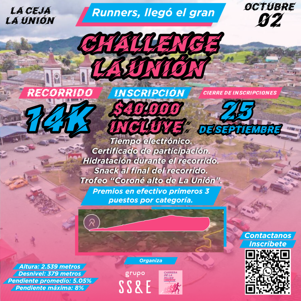 Por primera vez en el Oriente Antioqueño se llevará a cabo el Challenge La Unión, que tendrá un recorrido de 14 kilómetros y que es organizado por la Carrera de la Mujer Valle de San Nicolás y el grupo SS&E.